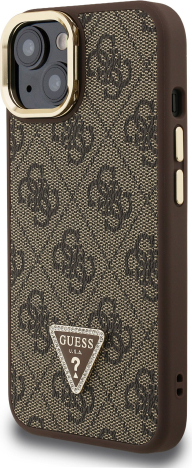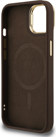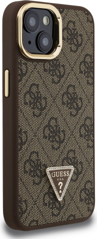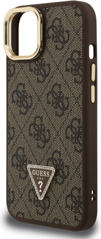 Guess PU 4G Strass Triangle Logo Stand Camera Frame MagSafe Case Защитный чехол для iPhone 14 / коричневый