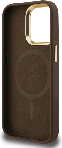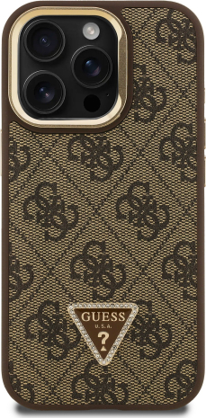 Guess PU 4G Strass Triangle Logo Stand Camera Frame MagSafe Case Защитный чехол для iPhone 15 Pro / коричневый