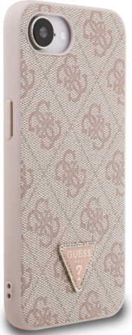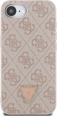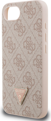 Премиальный чехол-накладка Guess PU 4G Strass Triangle Metal Logo имеет элегантный, характерный узор 4G, дополненный золотым треугольным логотипом GUESS.
