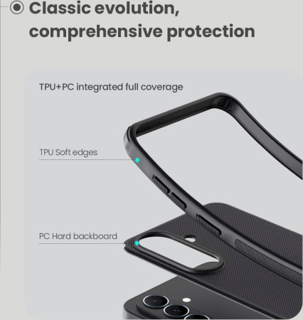 Задняя часть чехла выполнена из прочного и жесткого пластика, а боковые стороны — из мягкого термополиуретана (ТПУ).