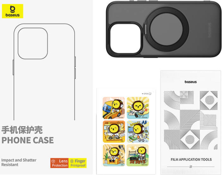 Baseus SkyRing Magnetic case with stand for iP 15 Pro + tempered glass and cleaning kit (black).The Baseus SkyRing Magnetic case is designed for superior protection for your iPhone 15 Pro. Made of durable materials, it provides reliable protection against scratches, shocks and drops, while maintaining the sleek look of your device. It has a built-in stand that allows you to comfortably watch videos, view photos or use apps in landscape mode. You'll also find a tempered glass included to further protect the screen from damage.
