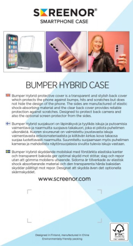 | Screenor Bumper – protective cover is a clear and stylish back cover which protects the phone against bumps, hits and scratches without hiding the design of the phone. The sides are manufactured of German elastic shock-absorbing UV-protected Desmopan TPU -speciality material and the clear back provides reliable protection against scratches.