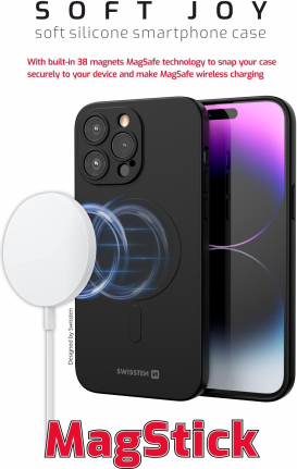 Элегантный черный силиконовый чехол SWISSTEN SoftJoy MagStick подходит для подзарядки MagSafe. |