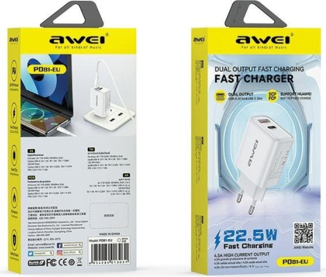 Сетевая зарядка Awei PD81-EU 22.5W USB-A/USB-C черная