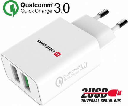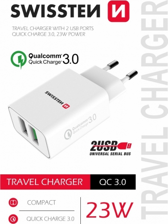 | Зарядное устройство Swissten имеет два выходных порта USB. Первый использует технологию Qualcomm 3.0, а второй имеет выходную мощность 5 Вт. Упаковано в розничную упаковку SWISSTEN.