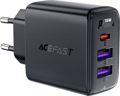 Acefast A57 GaN 2xUSB-A+USB-C PD35W EU (black) charger.Need a charger that will provide you with fast and reliable charging for all your devices? Acefast A57 is the answer to your needs! Equipped with 3 USB ports, it offers fast charging with up to 35 watts of power. It is compatible with many popular devices, and numerous safety features will take care of the safety of use.