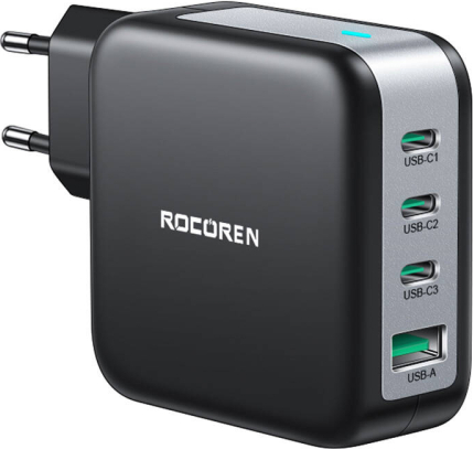 Wall charger GaN Rocoren 3x USB-C, 1x USB, Power Delivery 3.0, 100W (black)