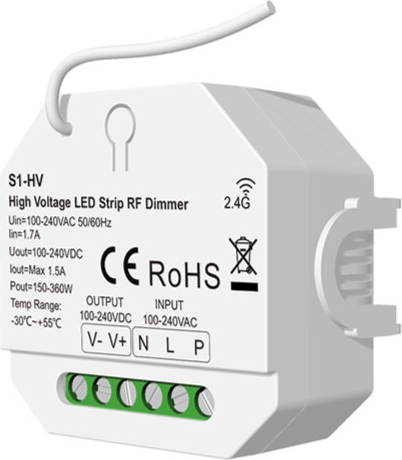 | S1-HV high voltage LED strip dimmer, for single-color LED strips, with Push-Dimm function, 1 channel, for max. 25m LED strip, 150-360W Features: The high-voltage controller is suitable for controlling single-color LED strips up to 25 meters long, with a maximum power of 360W. It is designed to regulate light intensity. The device operates with 100-240VAC voltage and can regulate current up to 1.5A. Supports lighting systems: single color. The controller enables smooth dimming or brightening with up to 4096 levels from 0 to 100% and is compatible with dimmable LED strips. The controller allows light on/off fade time up to 3 seconds. The LED dimmer is compatible with RF 2.4 GHz single-zone or multiple zone dimming remote controls. One RF controller can be paired with up to ten remote controls. It features an auto-transmitting function, automatically forwarding the signal to another controller within a 30-meter range. The controller also supports synchronized operation with multiple other controllers. A pairing button (MATCH) is provided for easy connection with remote controls. The device uses advanced PWM (Pulse Width Modulation) digital control technology for precise dimming of constant voltage LED lamps. It features Push-Dimm functionality, allowing connection of a standard momentary (bell-type) switch. Compact and space-saving, the controller fits directly into a standard wall mounting box behind a regular push switch. Certified with CE, EMC, RED and RoHS. Technical specifications: Product model: S1-HV. Number of channels: 1. Controlled lighting systems: single-color. Operating frequency: RF 2.4GHz. Input voltage: 100V-240V AC. Input current: 1.7A. Output voltage: 100V-240V AC. Output current: 1.5A. Max. output power: 150-360W. PWM frequency: 2kHz. Grey scale: 4096 levels. Dimming range: 0-100%. Operating distance: up to 30m (open area). Certificates: CE, EMC, LVD, RED, RoHS. Operating temperature: -30~+55°C. Dimensions: 56 x 49.5 x 28 mm. Color: white. Weight: 67g. Warranty: 24 months. ![]() |