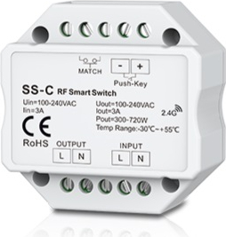 | Smart RF switch, without dimming function, 100-240V AC 1x 6A, for single color LED strips, incandescent and halogen lamps, 1 channel, Push-Key. Features: Supports lighting systems: single color. Allows you to turn on/off the lighting. Compatible with single color LED strips/lamps, incandescent lamps, halogen lamps. Has no dimming function. Maximum load 6A. Has a Push-Key connector. The operating frequency is 2.4GHz, which ensures a stable signal at a distance of up to 30m, it is less disturbed by obstacles such as walls, partitions, etc. It has a matching button (MATCH) for connecting remote controls. Minimal design. Mounted on the wall under the switch, in a standard electrical installation box. The controller is universal, can work with various RF remotes. Protection against overload, overheating and short circuit. Certificates: CE (EMC/LVD), RoHS. Technical data: Product model: SS-C. Compatibility: Skydance RU4, RU8, PF1-2. Number of channels: 1. Controlled lighting systems: single color. Operating frequency: RF 2.4GHz. Supply voltage: 100-240V AC. Output voltage: 100-240V AC. Output current: 6A. Power: 600W-1440W. Operating distance: up to 30m. Safety class: IP20 (not waterproof). Certificates: CE, EMC, LVD, RED, RoHS. Operating temperature: -30~+55°C. Dimensions: 52 x 52 x 26 mm. Color: white. Weight: 53g. Warranty: 24 months. |