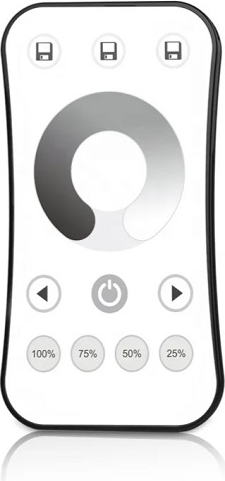 | RF remote control for LED strip management, designed to adjust single-color brightness. Operates at 2.4GHz, supports 1 zone, features a touch-sensitive wheel, 3 scene modes, and 256 brightness levels. Features: Supported lighting systems: single-color. Controls one lighting zone with 3 saved lighting scenes. Enables smooth dimming and brightening of the light. Compatible with dimmable LED strips and bulbs. The touch-sensitive wheel allows convenient brightness adjustment. Four standard brightness level buttons (100%, 75%, 50%, and 25%) provide quick and simple control. Short press adjusts brightness in 10 levels. Long press adjusts brightness in 256 levels. Automatically switches to “sleep” mode and can be reactivated with any button press. In standby mode, the battery lasts up to 1 year. The RF remote operates at 2.4GHz, ensuring a stable signal up to 30m, with reduced interference from obstacles such as walls or partitions. Ergonomic design, comfortable to hold, compact pocket size, and ultra-thin. The R6-1 remote control is universal and can work with various LED controllers or wireless wall switches. Comes with a convenient wall-mounted holder. Technical data: Product model: R6-1. Number of zones: 1. Controlled lighting systems: single color. Operating frequency: RF 2.4GHz. Operating current: <5mA. Standby current: <10uA. Operating distance: up to 30m. Power supply: 3V DC 1x CR2032 battery (included). Buttons: 1 touch ring and 10 buttons. Safety class: IP20 (not waterproof). Holder installation: external (with 2 screws/sticker). Certificates: CE, EMC, LVD, RED, RoHS. Operating temperature: -30~+55°C. Remote dimensions: 107 x 58.5 x 9 mm. Holder dimensions: 68 x 63 x 37 mm. Color: white. Weight: 48g. Complete set: R6-1, holder, 1x battery, 2x holder fixing screws, adhesive tape, user manual. Warranty: 24 months.  |