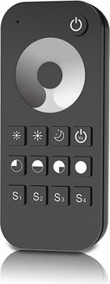 | RF remote control for LED strip single color dimming, 2.4GHz, 1 zone, with touch wheel, supports 4 scenes, 10 light-modes control. Features: Supports lighting systems: single color. Can control one lighting zone in 4 different scenes. Allows you to smoothly dim or brighten the lighting in 10 levels. Compatible with dimmable LED strips/bulbs. The sensitive touch wheel allows you to adjust the color of the lights. Automatically switches to "sleep" mode. Activated by pressing any button. In standby mode, batteries last up to 2 years. The operating frequency of the RF remote control is 2.4GHz, which ensures a stable signal at a distance of up to 30m, it is less disturbed by obstacles such as walls, partitions, etc. Hand-held, compact, pocket-sized design. RT1 remote control is universal, it can work with various LED controllers or with wireless wall switches. Complete with a convenient wall bracket. Technical data: Product model: RT1. Compatibility: Skydance V1, V3, V4-D, V4, V4-L, VP, V2, V2-L.. Number of zones: 1. Controlled lighting systems: single color. Operating frequency: RF 2.4GHz. Operating current: <5mA. Standby current: <10uA. Operating distance: up to 30m. Power supply: 3V DC 2x AAA batteries (included). LED indicator: 1. Buttons: 1 touch ring and 13 buttons. Safety class: IP20 (not waterproof). Holder installation: external (with 2 screws/sticker). Certificates: CE, EMC, LVD, RED, RoHS. Operating temperature: -30~+55°C. Remote dimensions: 122 x 53 x 17.5 mm. Holder dimensions: 53 x 58 x 22 mm. Color black. Weight: 60g. Complete set: RT1, holder, 2x batteries, 2x holder fixing screws, adhesive tape, user manual. Warranty: 24 months. |