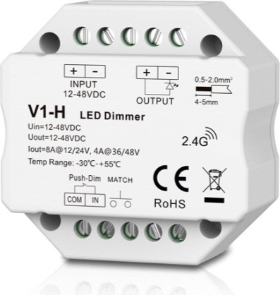 | V1-H constant voltage controller 12-48V DC 1x 8A, for single-color LED strips, with Push-Dimm function, 1 channel Features: The constant voltage controller is suitable for managing constant voltage lighting devices such as single-color LED strips, constant voltage LED panels, and similar fixtures. It enables smooth dimming or brightening with up to 4096 levels from 0 to 100% and is compatible with dimmable LED strips and bulbs. The controller allows light on/off fade time up to 3 seconds. The LED dimmer is compatible with RF 2.4 GHz single-zone or multi-zone dimming remote controls. One RF controller can be paired with up to ten remote controls. It features an auto-transmitting function, automatically forwarding the signal to another controller within a 30-meter range. The controller also supports synchronized operation with multiple other controllers. A pairing button (MATCH) is provided for easy connection with remote controls. The device uses advanced PWM (Pulse Width Modulation) digital control technology for precise dimming of constant voltage LED lamps. It features Push-Dimm functionality, allowing connection of a standard momentary (bell-type) switch. Compact and space-saving, the controller fits directly into a standard wall mounting box behind a regular push switch. It includes built-in protection against reverse polarity and short circuits. Certified with CE, EMC, and RoHS. Technical specifications: Product model: V1-H. Number of channels: 1. Controlled lighting systems: single-color. Operating frequency: RF 2.4GHz. Input voltage: 12V-48V DC. Output voltage: 12V-48V DC. Output current: 8A@12/24V; 4A@36/48V. Power: 96W@12V; 192W@24V; 144W@36V; 192W@48V. PWM frequency: 500Hz. Grey scale: 4096 levels. Dimming range: 0-100%. Dimming curve: logarithmic. Operating distance: up to 30m (open area). Protection class: IP20 (non-waterproof). Suitable wire cross-section: 0.5–2 mmІ. Certifications: CE, EMC, RoHS. Operating temperature: -30~+55°C. Dimensions: 52 x 52 x 26 mm. Color: white. Weight: 49g. Warranty: 24 months. ![]() |