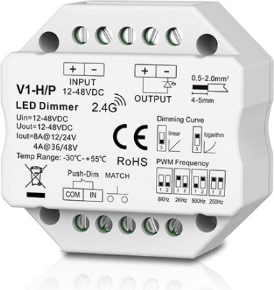 | V1-H/P constant voltage controller 12-48V DC 1x 8A, for single color LED strips, with Push-Dimm function, 1 channel Features: The V1-H/P is a smart LED controller designed for single-color lighting systems such as LED strips, LED panels, or dimmable LED bulbs. It ensures ultra-smooth dimming or brightening with 4096 levels of adjustment from 0 to 100%, without flickering or visual distortion. Powered by advanced PWM (Pulse Width Modulation) digital dimming technology for constant voltage LED lighting, it offers selectable output frequencies of 500Hz/ 2kHz/ 8kHz/ 16kHz. Users can also choose between logarithmic or linear dimming curves and set light on/off fade time up to 3 seconds. Can be controlled by 2.4 GHz RF remote controls, push switches One controller can be linked with up to 10 RF remotes, and one remote can control an unlimited number of controllers within a 30-meter range. An integrated MATCH button allows easy pairing with remote controls. It features Push-Dimm functionality, allowing control via a standard push switch. Compact in size, the unit fits easily into a standard wall junction box behind a regular switch. The device includes protections against reverse polarity and short circuits. It is certified to CE and RoHS standards, making it a versatile, reliable, and smart solution for various LED lighting projects. Technical specifications: Product model: V1-H/P. Channels: 1. Supported lighting systems: single-color. Control frequency: RF 2.4GHz. Input voltage: 12V-48V DC. Output voltage: 12V-48V DC. Output current: 8A@12/24V; 4A@36/48V. Output power: 96W@12V; 192W@24V; 144W@36V; 192W@48V. PWM frequency: 500Hz/ 2kHz/ 8kHz/ 16kHz. Gray scale: 4096 levels. Dimming range: 0-100%. Control distance: up to 30m. Safety class: IP20 (not waterproof). Compatible wire cross-section: 0.5-2.0 mmІ. Certifications: CE, EMC, LVD, RED, RoHS. Operating temperature: -30 to +55°C. Dimensions: 52 x 52 x 26 mm. Color: white. Weight: 61g. Warranty: 24 months. ![]() |
