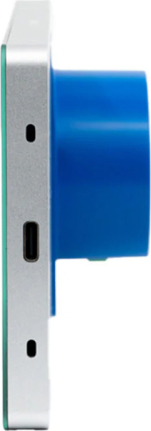 Close-up of the silver edge of the Shelly X2i panel with the USB-C port and sensors visible, with a second panel visible in the background.