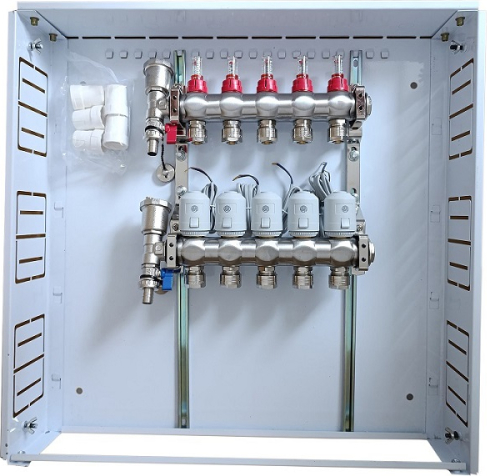 | Underfloor heating manifold 5 loops with thermal actuators NC AC230V and flow meters The set includes: Flush mounting metal box, 5 loops collector, flow meters and NC AC230V thermal actuators. Features: The UFH (undefloor heating manifold) is the control centre for your underfloor heating, allowing you to individually control the zones designed into the system, ensuring warm water flows to the spaces that need heating and not to those that don't. Electric thermal actuator is designed for controlling the heat distribution equipment. It receives commands from automation devices (such as room thermostats or hub controller) and adjusts the water flow distribution according to set parameters. The thermal actuator allows precise control of room temperature and energy consumption. The thermal actuator is in NC (normally closed) state. The actuator works with any type of programmable or non-programmable room thermostats. Simple installation, the thermal actuators are connected to the manifold via a VA80 thread adapter. Valve thread adapter VA80 allows easy connection to standard thread M30, locking securely. Energy consumption of each drive is only 2W. The supplied flow meters (flow indicators) are intended for monitoring the flow of water and adjusting pressures. The collector cabinet is installed on the wall, flush mounting. The door with a tongue, locks, opens at an angle of 135 degrees. Technical specifications: Manifold: Installation: flush mounting. Size: 640x640x118mm Depth: 110mm. Door dimensions: 580mm x 580mm. Number of flow meters: 5 pcs. Number of thermal actuators: 5 pcs. Air vent nodes: 2 pcs. Heating circuit pipe 16mm adapters: 5 pcs. Color: light gray. Thermal actuator: Purpose: water heating system. Operating type: NC (normally closed). Operating voltage: AC 230V, 50/60Hz. Starting current: max. 300mA. Power consumption: 2W. Installation: connected to the collector via an adapter. Adapter: VA 80. Cable length: 90cm. Operating temperature: 0°C~ +60°C. Storage temperature: -25°C~ +65°C. Operating humidity: < 80%RH (non-condensing). Safety class: IP54. Dimensions: D49.4mm x 56.6mm. Warranty: 12 months. |