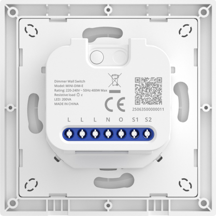 SONOFF MINI-DIM-E smart WiFi wall switch/dimmerSONOFF MINI-DIM-E smart switch with Matter over WiFi support. It allows you to smoothly adjust the brightness of your lighting, create scenes, and monitor energy consumption. It supports schedules, smart scenes, and voice control, so you can easily adjust your lighting to the time of day and your habits. Automatic calibration makes it easy to adjust to the connected load, and built-in protections against overheating and power surges increase operational safety.