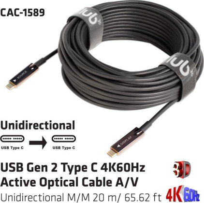 USB Gen 2 Type C 4K60Hz Active Optical Cable A/V Unidirectional M/M 20 m/ 65.62 ft Manufacturer Website: https://www.club-3d.com/en/detail/2502/usb_gen_2_type_c_4k60hz_active_optical_cable_a-v_unidirectional_m-m_20_m-_65.62_ft/ | ||||||||||||||||||||||||||||||||