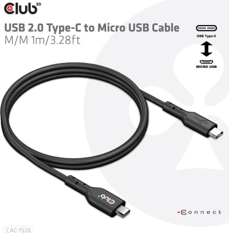 USB 2.0 Type-C to Micro USB Cable M/M 1m /3.28ft Manufacturer Website: https://www.club-3d.com/en/detail/2537/usb_2.0_type_c_to_micro_usb_cable_m-m_1m_-3.28ft/ | ||||||||||||||||||||||||||||||||
