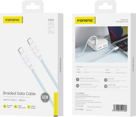 Foneng XS02 60W USB-C to USB-C cable, 1.2m (blue)The 1.2m long Foneng XS02 cable is the perfect combination of style and functionality. Its braided, colorful design is not only eye-catching, but also ensures reliability during daily use, offering precise and fast charging with 60W of power. The Foneng XS02 is designed for laptops, smartphones, wireless headphones or tablets that support USB-C to USB-C input.