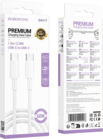USB кабель Borofone BX117 60W USB-C to USB-C 1.0m белый