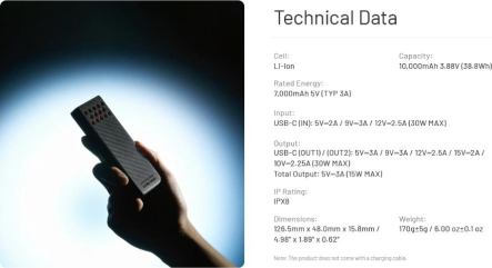 The NITECORE CARBO 10000 Gen2 Professional Outdoor Fast-Charge Power Bank supports up to 30W two-way fast charging. With an IPX8 waterproof rating, it features a carbon fiber shell, magnesium alloy heat sinks, and a high-energy-density cell, delivering reliable power for every outdoor adventure Manufacturer Website: https://flashlight.nitecore.com/product/carbo10000_gen2 | ||||||||||||||||||||||