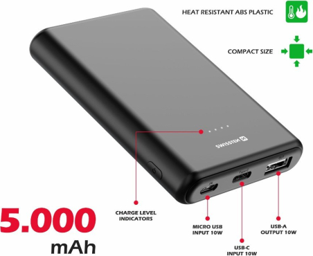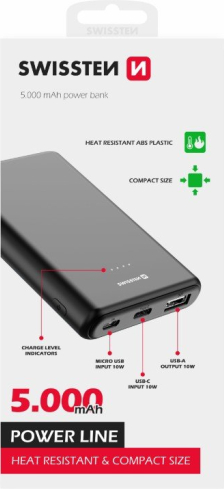 SWISSTEN Powerbank емкостью 5000 мАч, входами microUSB и USB-C и выходом USB-A 10 Вт.