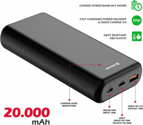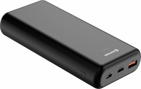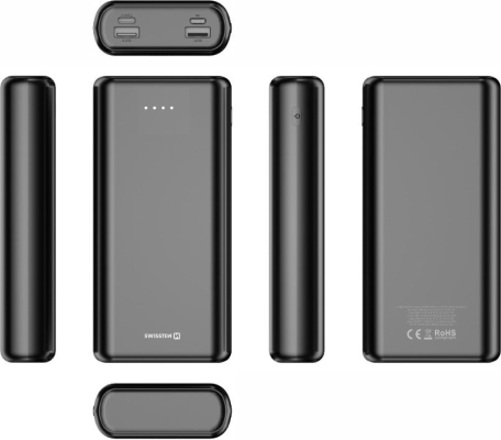Внешний аккумулятор SWISSTEN емкостью 20 000 мАч с разъемами microUSB, USB-C и USB-A, USB-C и быстрой зарядкой PD и QC.