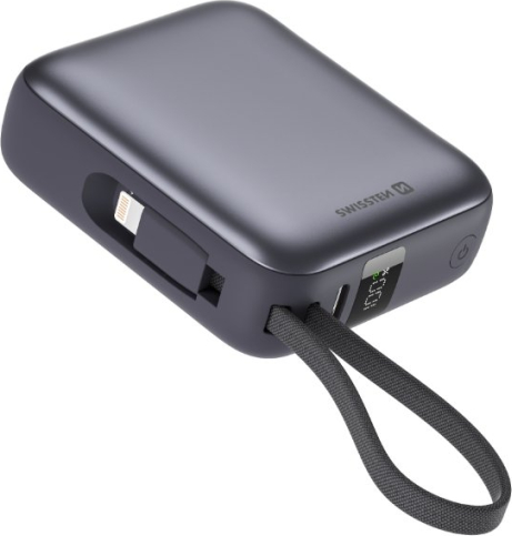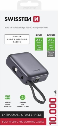 SWISSTEN POWER BANK 10 000 mAh серебристого цвета — идеальный выбор для пользователей, которые ценят удобство без ущерба для производительности. Благодаря встроенным кабелям USB-C и Lightning вы можете без труда заряжать устройства Android и Apple в любое время и в любом месте.