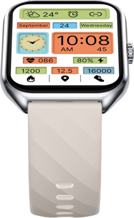 Silver smartwatch on a white background displaying various health functions, weather and time