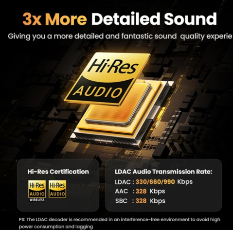 Universal Compatibility Supports a full range of Bluetooth profiles — HFP, AVRCP, A2DP, BLE, SPP — and advanced audio codecs including AAC, SBC, and LDAC for high-quality wireless playback.