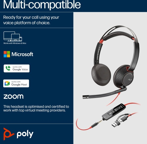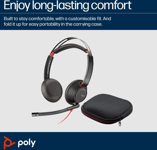 HP Poly Blackwire 5220 Stereo Wired Headset, USB-C, 3.5mm, USB-C/A Adapter (Bulk), Black (8X231AA/8X231A6)