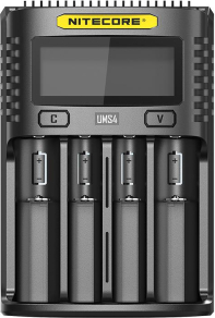 The Nitecore UMS4 is an intelligent USB four slot charger, with QC input available for speedy charging. The total maximum output is 4000mA or 3000mA when using a single slot. Please note, in order to achieve the maximum charging speed a 9V 2A QC 2.0 charging adapter must be used. When using a QC adapter, the UMS4 can charge a 3500mAh 18650 to 80% in just 55 minutes!