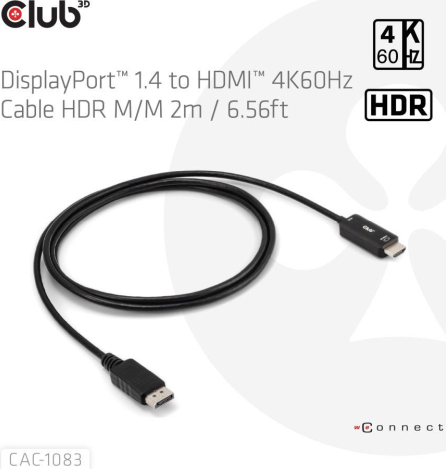 DisplayPort™ 1.4 to HDMI™ 4K60Hz Cable with HDR M/M 2 m / 6.56ft 32 AWG Manufacturer Website: https://www.club-3d.com/en/detail/2673/displayportt_1.4_to_hdmit_4k60hz_cable_with_hdr_m-m_2_m_-_6.56ft_32_awg/ | ||||||||||||||||||||||||||||||