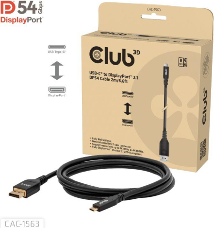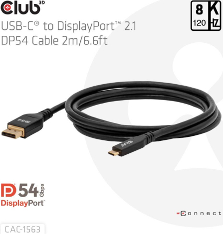 The Club 3D CAC-1563 USB-C® to DisplayPort™ 2.1 DP54 cable allows you to connect your USB-C® laptop to a DisplayPort® monitor. It can also be connected in reverse, using the DisplayPort® on your GPU to connect to a USB-C® monitor.