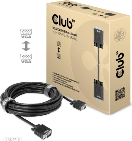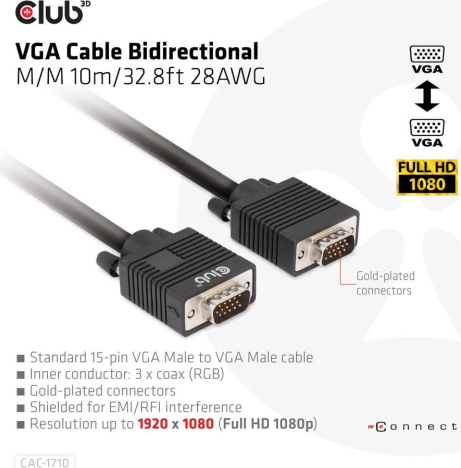 VGA Cable Bidirectional M/M 10m/32.8ft 28AWG Manufacturer Website: https://www.club-3d.com/en/detail/2587/vga_cable_bidirectional_m-m_10m-32.8ft_28awg/ | ||||||||||||||||||||||||||||||