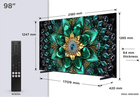 | Summary | TCL Q6C 98Q6C. Display diagonal: 2.49 m (98"), Display resolution: 3840 x 2160 pixels, HD type: 4K Ultra HD, Display technology: QD-Mini LED, Screen shape: Flat. Smart TV. Motion interpolation technology: PPI (Picture Performance Index) 4100, Native aspect ratio: 16:9. Digital signal format system: DVB-C, DVB-S2, DVB-T2. Wi-Fi, Ethernet LAN. Product colour: Metallic |