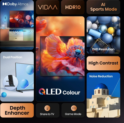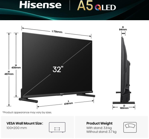 Summary Hisense 32A5Q. Display diagonal: 81.3 cm (32"), Display resolution: 1920 x 1080 pixels, HD type: Full HD, Display technology: QLED, Screen shape: Flat. Smart TV. Response time: 10 ms, Contrast ratio (typical): 1200:1, Native aspect ratio: 16:9. Digital signal format system: DVB-C, DVB-S, DVB-S2, DVB-T, DVB-T2. Wi-Fi, Ethernet LAN. Product colour: Black