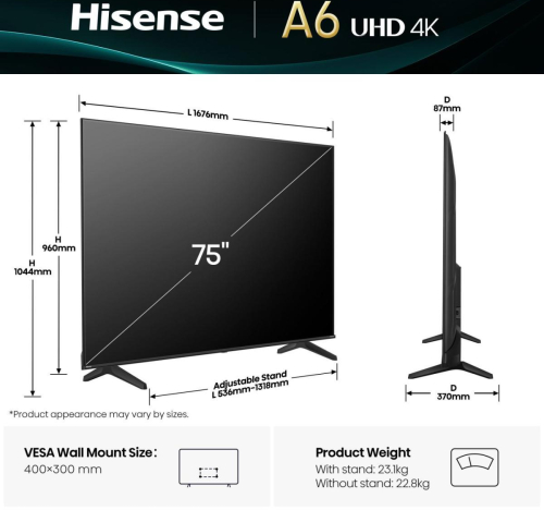 Summary Hisense 75A6Q. Display diagonal: 190.5 cm (75"), Display resolution: 3840 x 2160 pixels, HD type: 4K Ultra HD, Screen shape: Flat. Smart TV. Response time: 8 ms, Contrast ratio (typical): 1200:1, Native aspect ratio: 16:9. Digital signal format system: DVB-C, DVB-S, DVB-S2, DVB-T, DVB-T2. Wi-Fi, Ethernet LAN. Product colour: Black