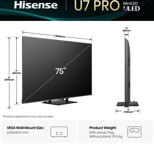 Summary Hisense U7Q PRO 75U7Q PRO. Display diagonal: 190.5 cm (75"), Display resolution: 3840 x 2160 pixels, HD type: 4K Ultra HD, Display technology: ULED, Screen shape: Flat, LED backlighting type: Mini LED PRO. Smart TV. Display brightness: 500 cd/m², Response time: 6.5 ms, Contrast ratio (typical): 5000:1, Native aspect ratio: 16:9. Digital signal format system: DVB-C, DVB-S, DVB-S2, DVB-T, DVB-T2. Wi-Fi, Ethernet LAN. Product colour: Black