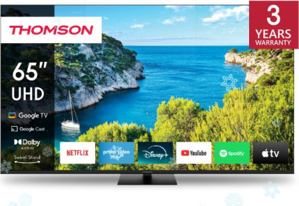 65UG5C14 THOMSONEnjoy the cinematic viewing quality of the Thomson Google TV 65" UHD. Google TV simplifies your entertainment experience by organizing content from your apps and subscriptions. Create multiple user profiles and benefit from curated recommendations. Enjoy a wide range of smart features, such as access to 400,000+ movies and TV shows, smart voice control with Google Assistant, and Google Cast to stream content from compatible smart devices to your TV. Immerse yourself in crystal clear 4K UHD image quality, that captures every detail with its four times higher resolution than Full HD. HDR10 technology enhances every scene with rich contrasts and balanced brightness, ensuring precise color reproduction and lifelike picture quality. The ergonomic remote control with smooth backlighting allows you to keep an eye on everything, even in dim lighting. And the integrated Google Assistant enables you to intuitively control your TV with voice commands. Search for your favorite movies, ask for recommendations based on your mood, or control compatible smart devices - all with the convenience of your voice. Benefit from increased placement flexibility with the central swivel stand and enhance your viewing experience. The innovative design enables you to effortlessly rotate your TV by up to 30 degrees, allowing you to find the perfect angle for your entertainment setup. The built-in triple tuner allows reception via satellite-antenna, terrestrial antenna or cable. So, you can receive all available channels without additional hardware. Manufacturer Website: https://tv.mythomson.com/Thomson-Google-TV-65-UHD/65UG5C14 | ||||||||||||||||||||||||||||||||||||||||||||||||||||||||||||||||||||||||