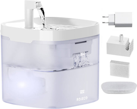 Compact construction and thoughtful designWith a capacity of 1.5 liters, the Rojeco fountain is ideal for small and medium-sized pets, such as cats and small dogs. The transparent tank makes it easy to monitor the water level, and the compact design allows the unit to be easily placed anywhere. An additional 120 ml emergency reservoir provides a supply of water in case of a power outage, so you can be sure that your pet will always have access to a drink.