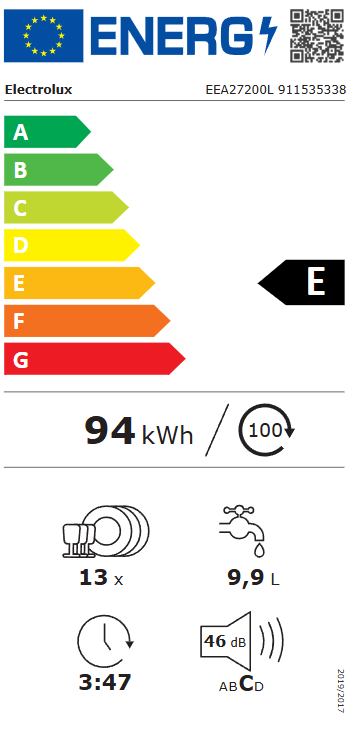 - Zems skaņas līmenis: tikai 46 (dB(A) re 1 pW) (2010/30/EC)