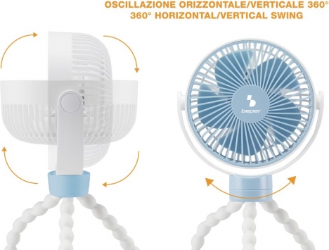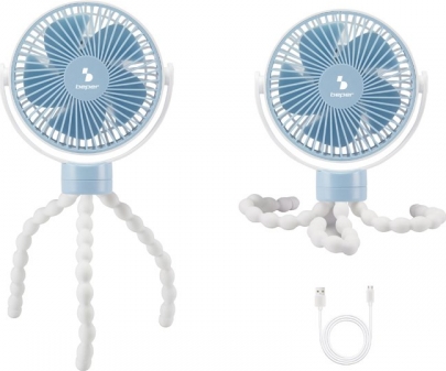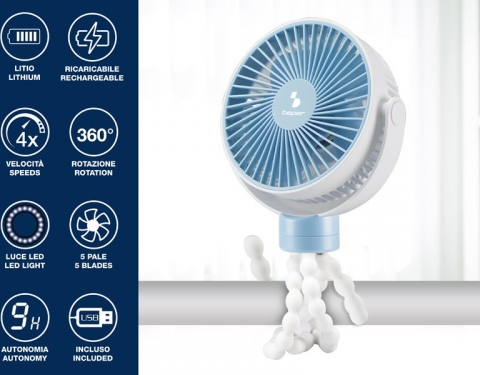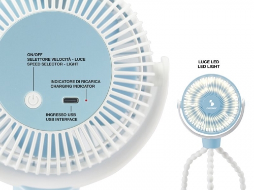 | Mazs uzlādējams ventilators, kas lieliski piemērots karstām vasaras dienām - elastīgās, mīkstās silikona kājas var locīt pēc jūsu vēlmēm, lai piestiprinātu ventilatoru pie sauļošanās krēsla, guļamkrēsla, bērnu ratiņiem, automašīnas galvas balsta vai novietotu uz galdiem, naktsgaldiņiem, plauktiem utt. Pateicoties integrētajam LED apgaismojumam, 4 ventilācijas ātrumiem un ilgstošam litija akumulatoram, kas ir uzlādējams, izmantojot USB kabeli, šis mazais ventilators ir lieliski piemērots ceļojumiem, kempingiem un visām āra aktivitātēm. Tehniskie dati Izmērs: 15,5 x 6,7 x 33 cm Materiāls: ABS ANS silīcijs Jauda: 3 W Akumulators: 2000 mAh litija akumulators Svars: 0,373 kg |