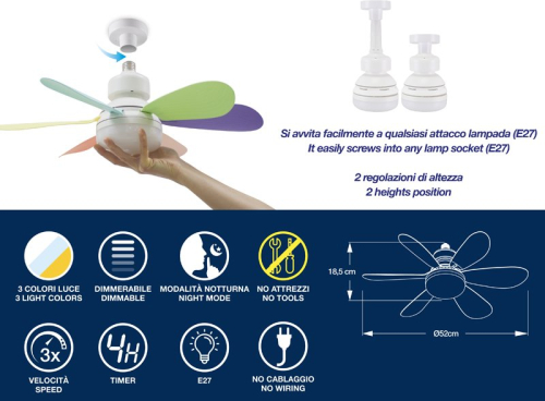 Griestu ventilators ar divām funkcijām: ventilācija un apgaismojums. Komplektā ietilpst 2 maināmu lāpstiņu komplekti: 6 baltas un 6 krāsainas lāpstiņas. 3 regulējami ventilācijas ātrumi un programmējams taimeris, izmantojot komplektā iekļauto ērto tālvadības pulti. Ideāli piemērots kā lustra, pateicoties enerģiju taupošajai A klases lampai ar E27 kontaktligzdu. 3 izvēles gaismas krāsas: balta, dabiska un silta gaisma. Regulējama gaismas intensitāte un nakts gaismas funkcija. Viegli uzstādāma spuldze, pateicoties komplektā iekļautajam lampas turētājam. Klusa darbība. Ventilatora augstums ir regulējams divās pozīcijās, pateicoties komplektā iekļautajam pagarinājumam. Piemērots dažādām telpām mājās, birojā un garāžā.