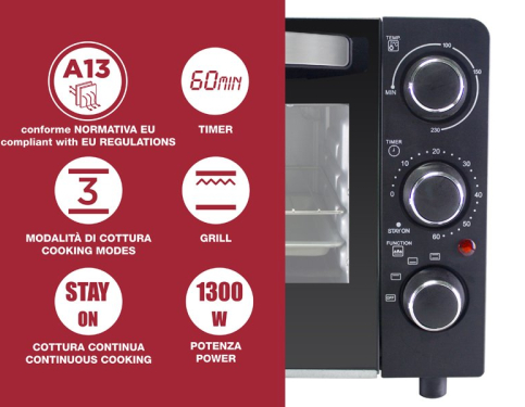 Elektriskā cepeškrāsns, kas atbilst A13 standartam. Dubulta stiklojuma durvis ar siltumizolētu rokturi. Tērauda sildelementi. 3 regulatori ļauj regulēt temperatūru līdz 230°C, izvēlēties gatavošanas režīmu starp pamata, grilu, kombinēto un iestatīt taimeri līdz 60 minūtēm ar zvaniņu vai izvēlēties funkciju “Stay-on” nepārtrauktai gatavošanai. Komplektā ietilpst alumīnija paplāte, tērauda grils un grila noņemšanas rokturis. Izmēri (ārējie): 41,5x36x27 cm Izmēri (iekšējie): 28x26x22 cm