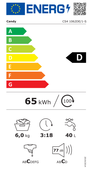 Enerģijas patēriņš (100 cikli): 65 kWh
