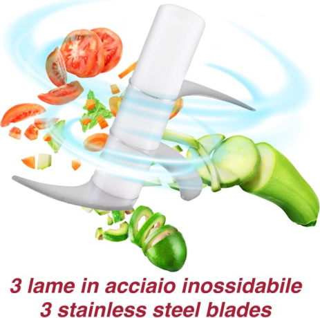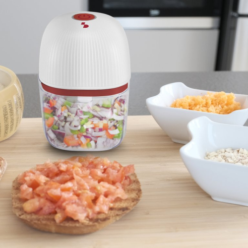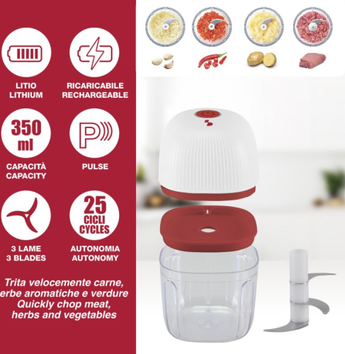 Kompakts un jaudīgs uzlādējams mini virtuves kombains ar litija akumulatoru. Produktam ir trīs nerūsējošā tērauda asmeņi, kas ātri sasmalcina gaļu, garšaugus un dārzeņus, vienkārši turot nospiestu darbības pogu. 350 ml trauks. Darbības laiks līdz 20 cikliem ar 5 stundu uzlādi. Komplektā iekļauts USB kabelis uzlādei.