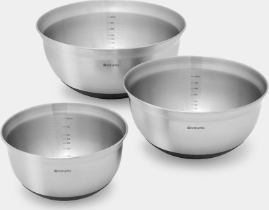 Brabantia Profile Mixing Bowl nerūsējošā tērauda bļodu komplekts, kurā ietilpst trīs maisītāja trauki - 1.0, 1.6 un 3.0 litri. Atzīmētās mērvienības bļodu iekšpusē atvieglo sastāvdaļu sajaukšanu. To speciāli izliektā bļodu mala ir veidota, lai noturētu bļodu optimālā maisīšanas pozīcijā, savukārt, silikona pamatne novērš nejaušu bļodas izslīdēšanu. Pamatnei ir karstumizturīgs materiāls līdz pat 220°C. Īsts super virtuves komplekts jūsu ēdiena pagatavošanai ikdienā PRODUKTA APRAKSTS Lielisks sākums virtuvei - 3 maisīšanas trauku komplekts (1L/1.6L/3L) Neslīdoša pamatne, nesaskrāpē galda virsmas Ērti satvert - ergonomiskas forma un malas Nav izšļakstīšanās - speciāla bļodas mala Iekšpusē ir norādītas produktu mērvienības skala Ietaupa vietu - savietojamas viena otrā Daudzpusība - karstumizturīgs pārklājums (Līdz 220°C) Izturīgs - izgatavots no nerūsējošā tērauda Viegli tīrāms - mazgājams trauku mazgājamā mašīnā Lietošana bez problēmām - 5 gadu garantija Izgatavots no pārstrādājamiem materiāliem. Videi draudzīgs SPECIFIKĀCIJAS Materiāls - nerūsējošā tērauda Drošs mazgāšanai trauku mazgājamā mašīnā