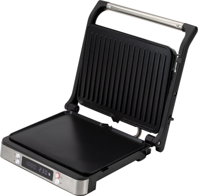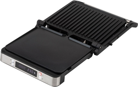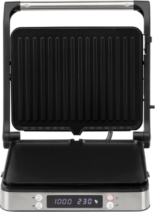 Digitāls vadības panelis. Temperatūras kontrole un taimeris. Pārveidojams par gludekli; Pilns atvēršanas leņķis 180º. Dažādas plāksnes, rievotas un gludas, 29 x 23,5 cm ar nepiedegošu pārklājumu. Noliecama augšējā plāksne, īpaši paredzēta īpaši bieza ēdiena gatavošanai. Vienmērīgs cepšanas spiediens. Aizdares klipši uzglabāšanai. Nerūsējošā tērauda virsmas un vēss rokturis. Tauku paplāte. Neslīdoša pamatne. Drošības aizsardzība pret pārkaršanu. Jauda 2000 W Spriegums 230 V 33,5 x 33,2 x 11,3 cm