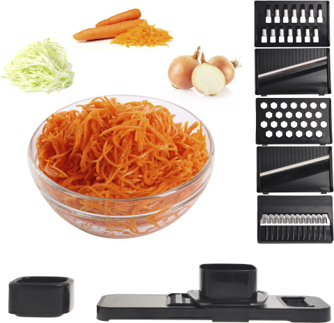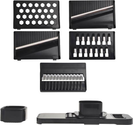 | Daudzfunkcionāla dārzeņu rīve, 3005, Kamille. Izgatavots no izturīgas plastmasas un nerūsējošā tērauda; asmeņi ir no nerūsējošā tērauda. Komplektā ietilpst seši maināmi asmeņi un ērts turētājs produktu satveršanai. Lieliski sagriež un sarīvē dārzeņus un augļus gardiem salātiem vai citiem iecienītiem ēdieniem. |